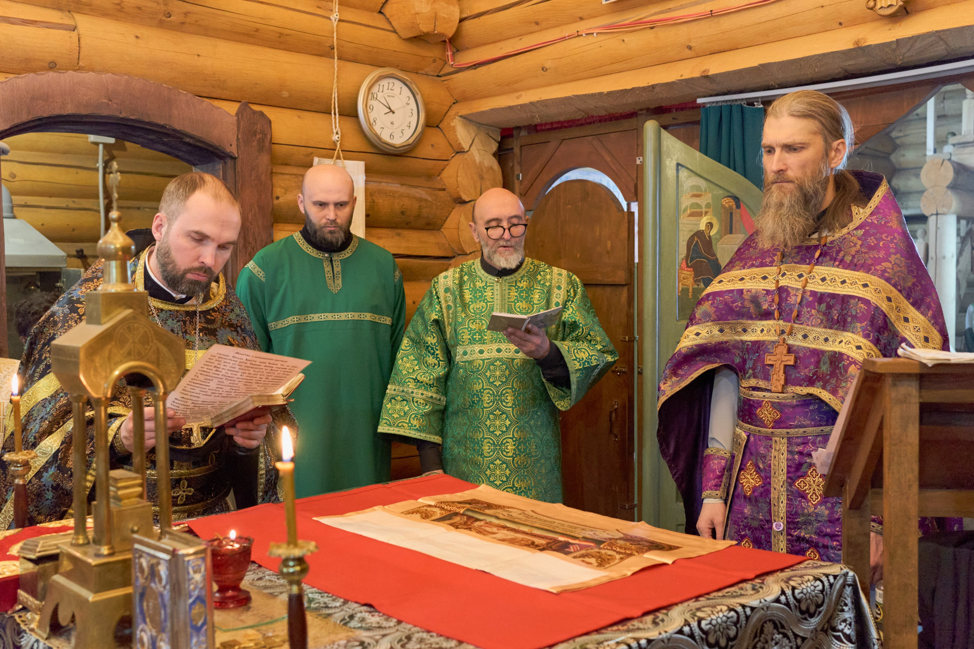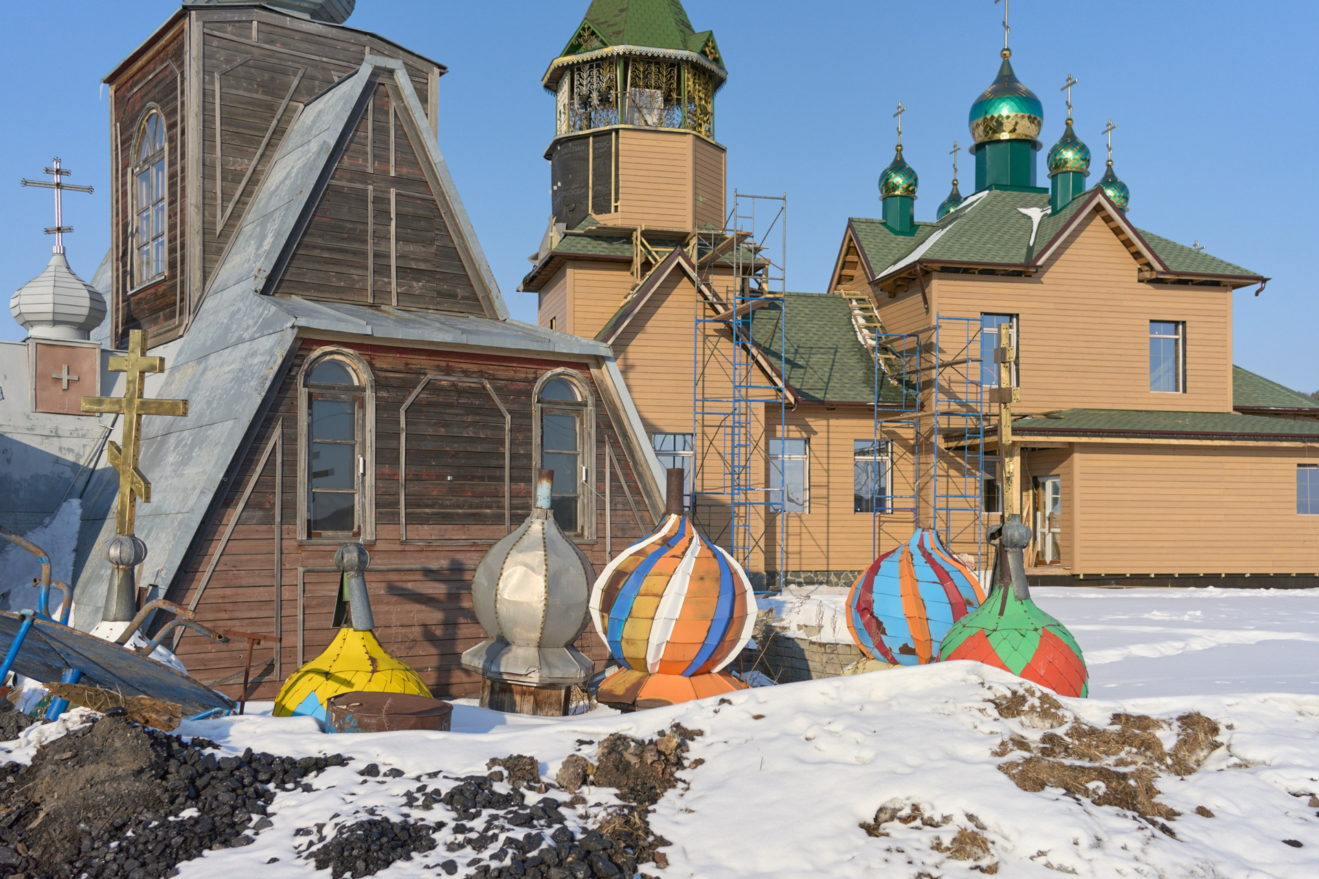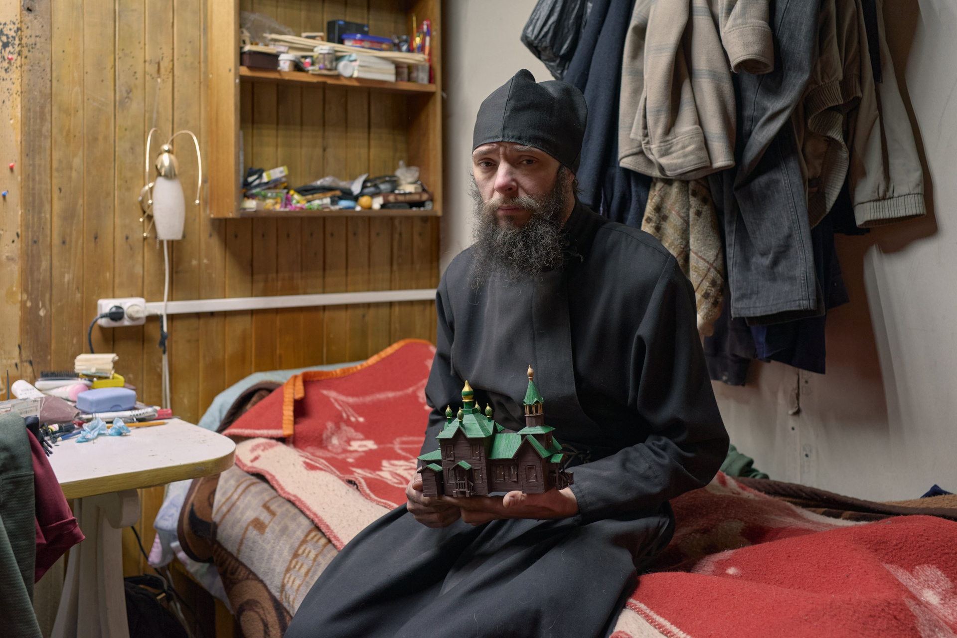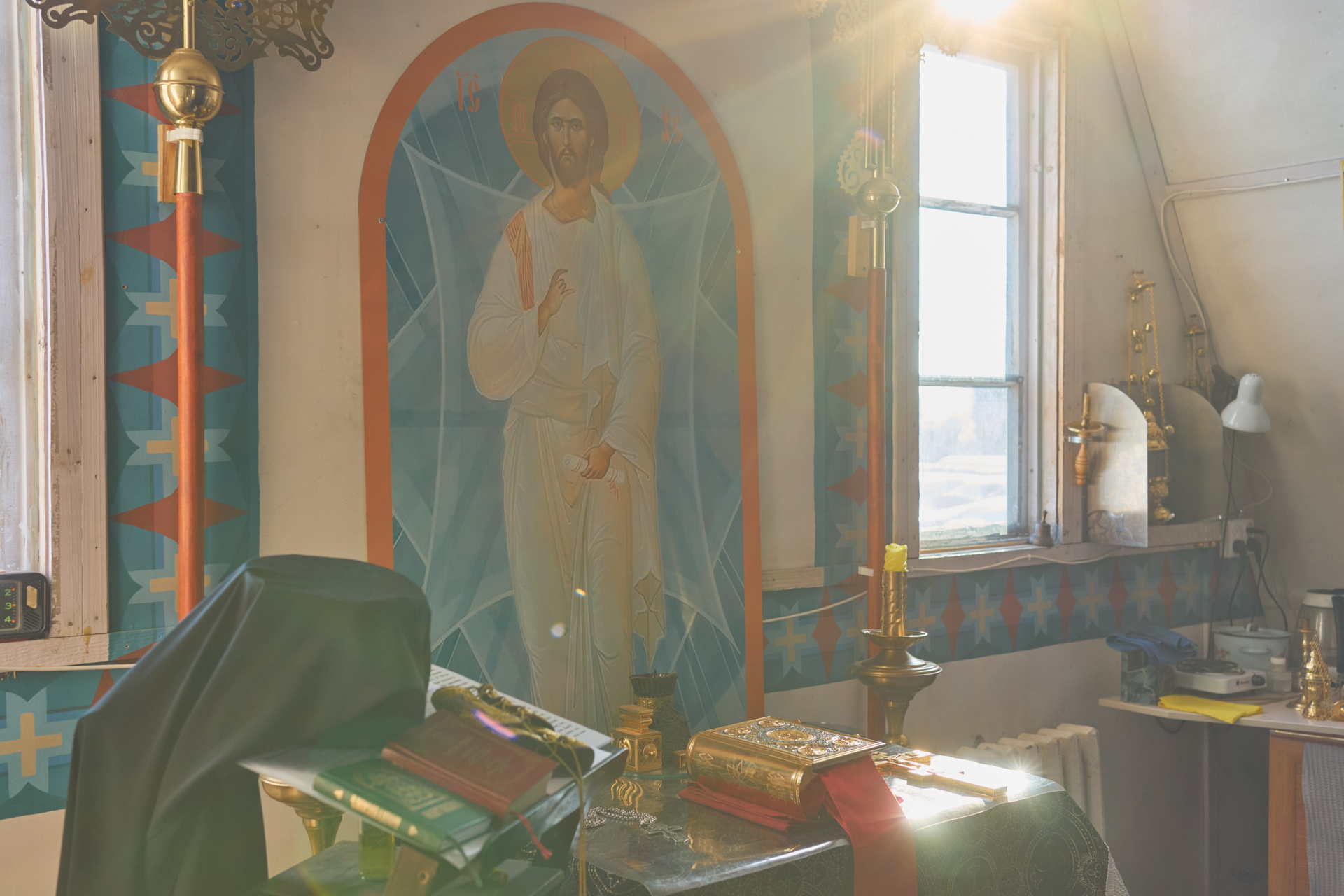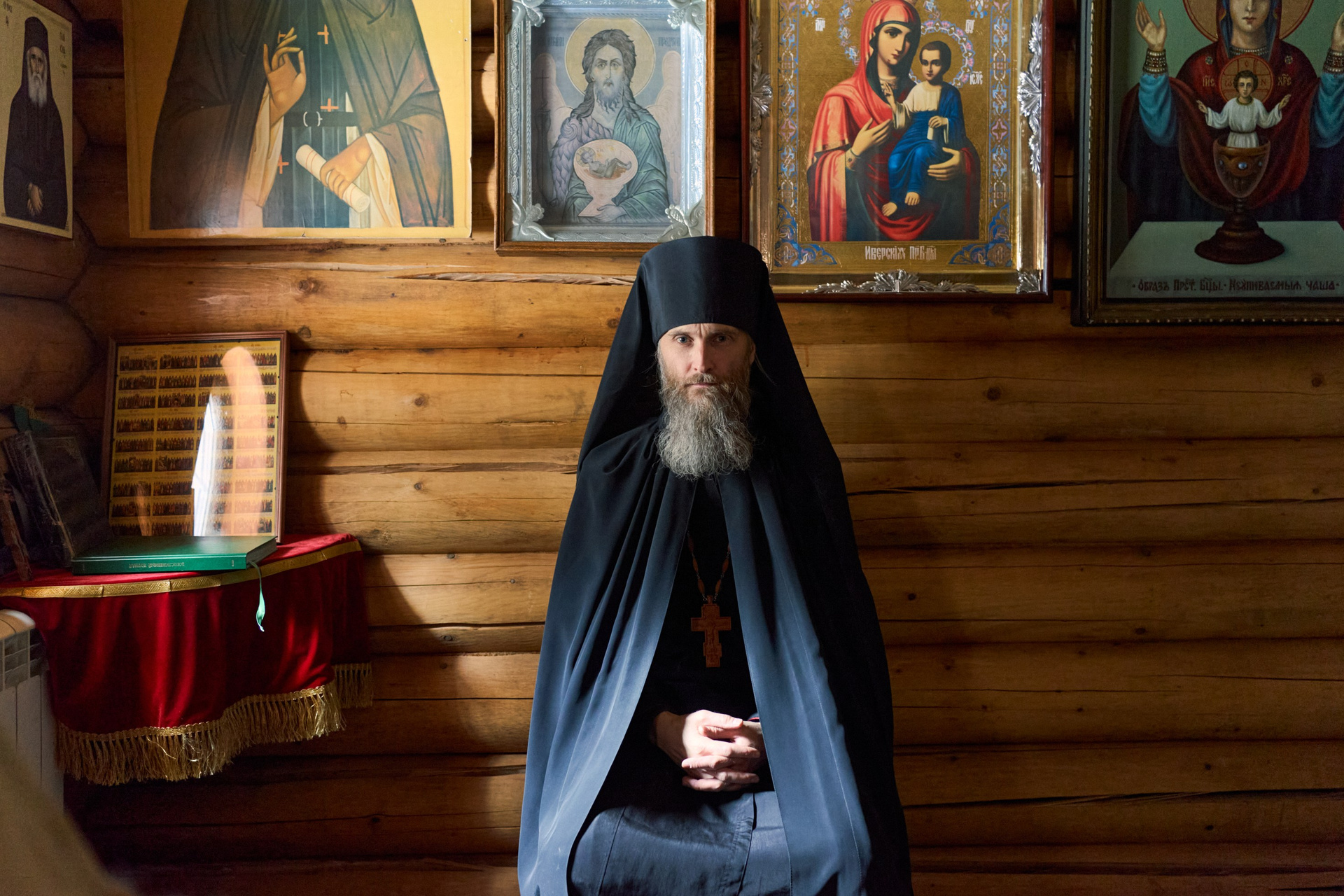 На момент съёмки, там находилось 3 человека: иеромонах Софроний, инок Олег и монах Зосима. Братья Олег и Зосима проживают в небольшом деревянном доме по соседству со строящимся монастырём, а ежедневную службу ведут в маленьком треугольном храме, где также расположена трапезная.