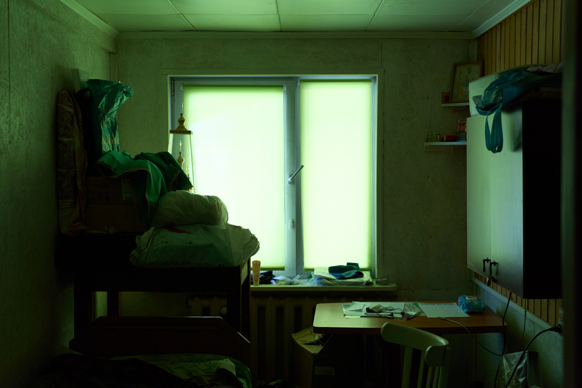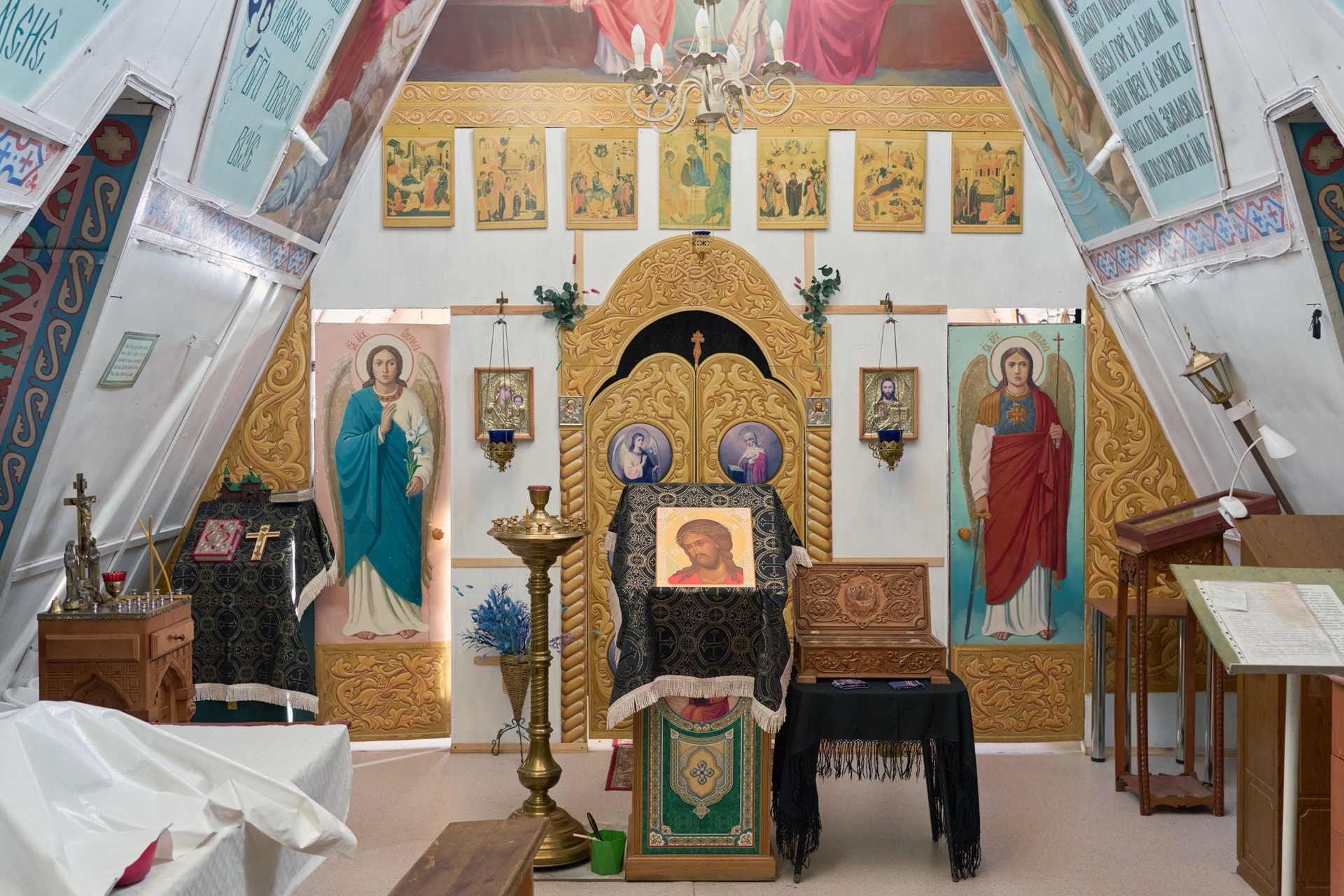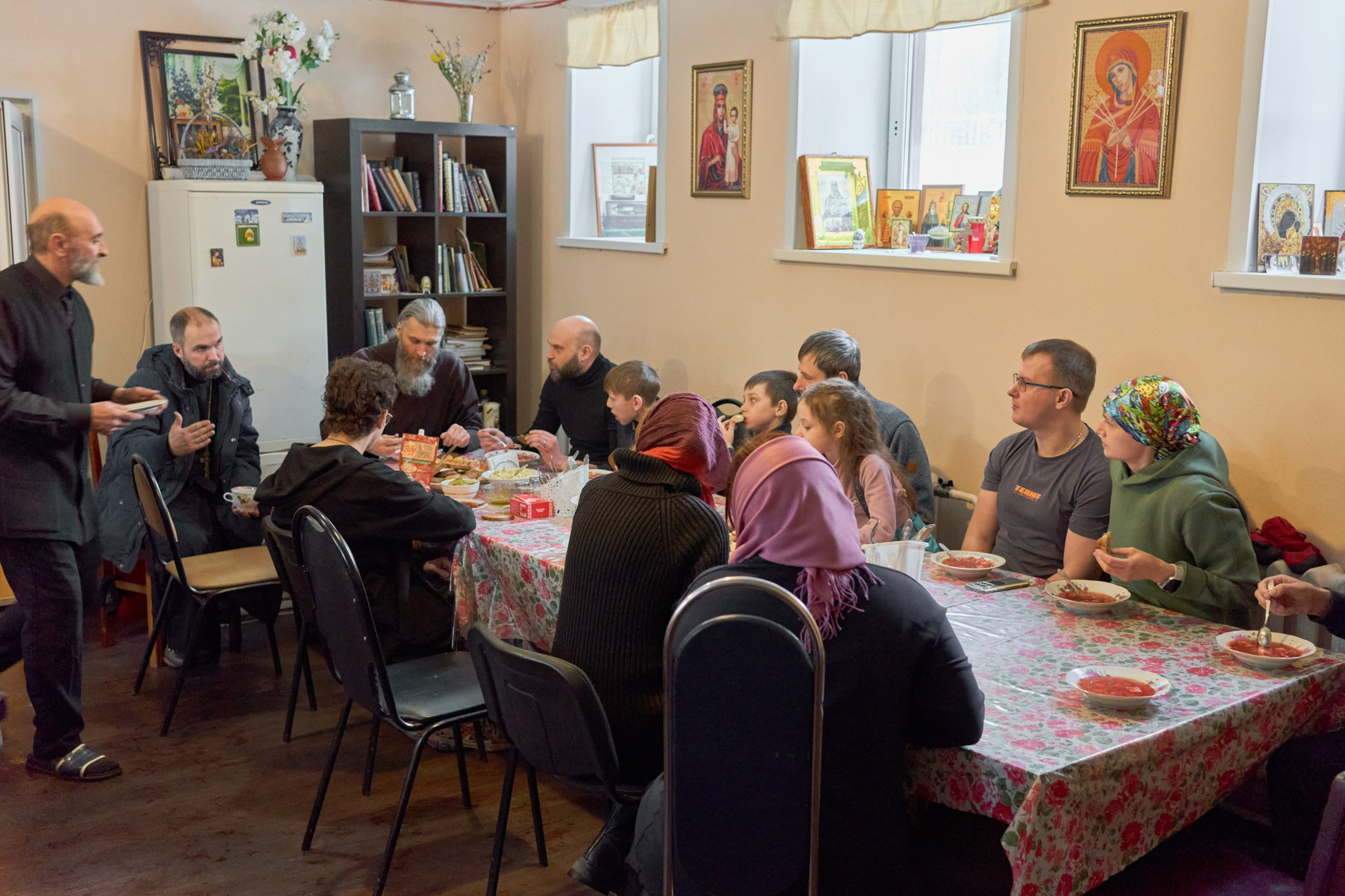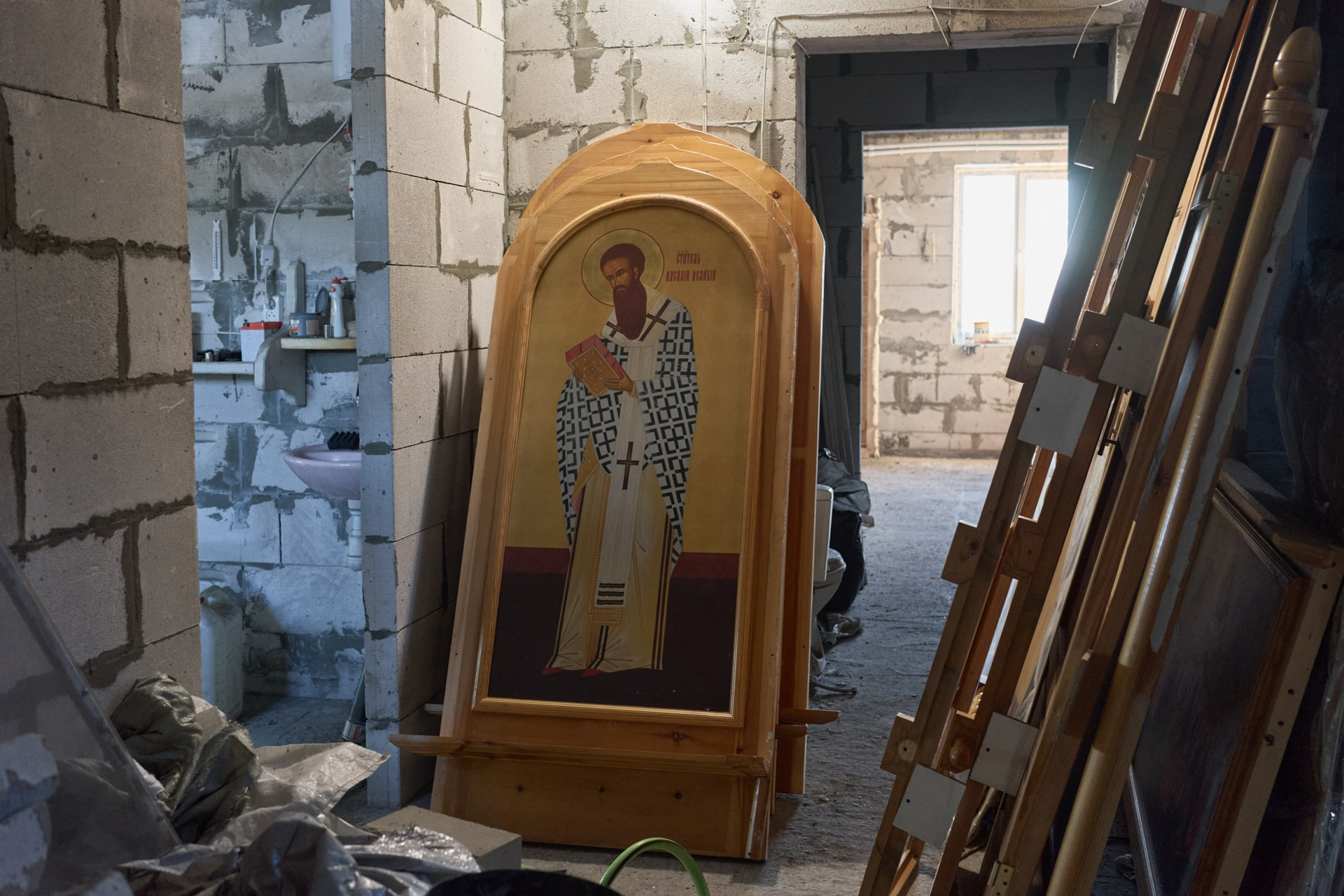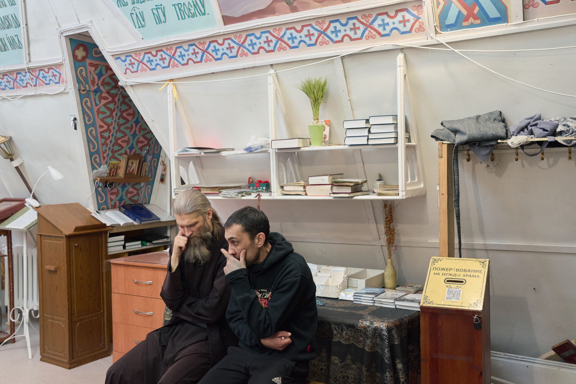 На момент съёмки, там находилось 3 человека: иеромонах Софроний, инок Олег и монах Зосима. Братья Олег и Зосима проживают в небольшом деревянном доме по соседству со строящимся монастырём, а ежедневную службу ведут в маленьком треугольном храме, где также расположена трапезная.